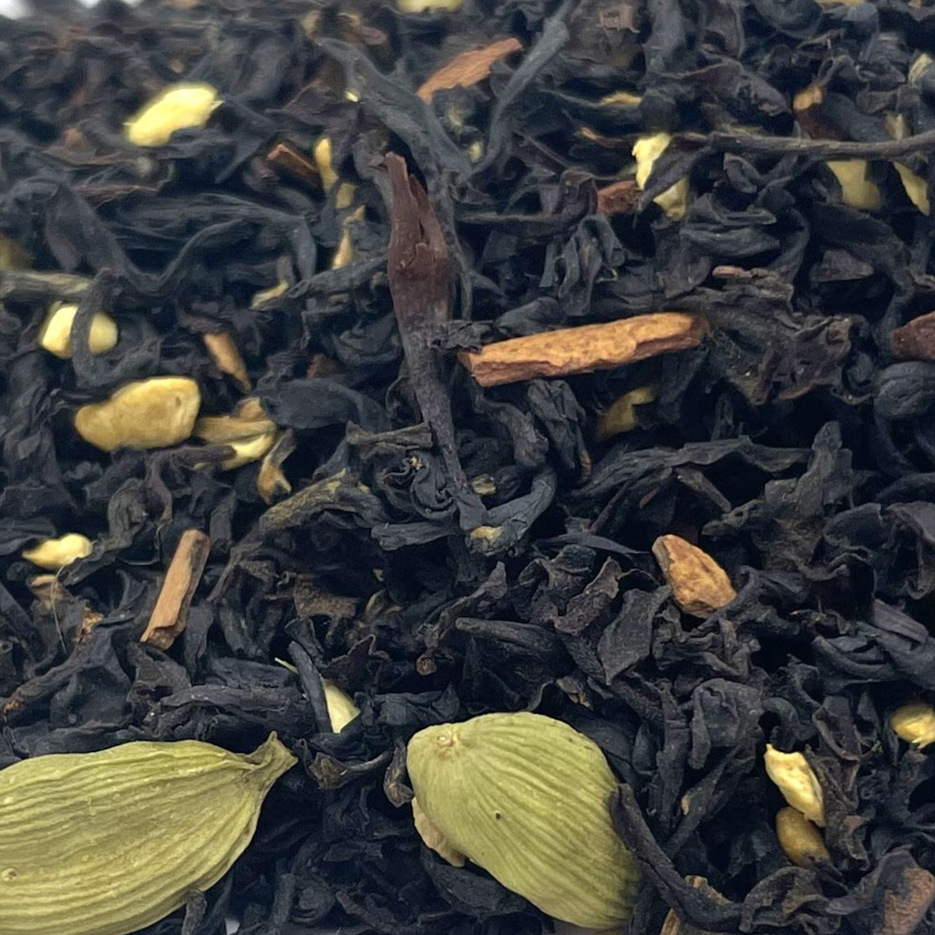 Chá preto, canela, gengibre, cravinho, cardamomo verde, pimenta preta moída